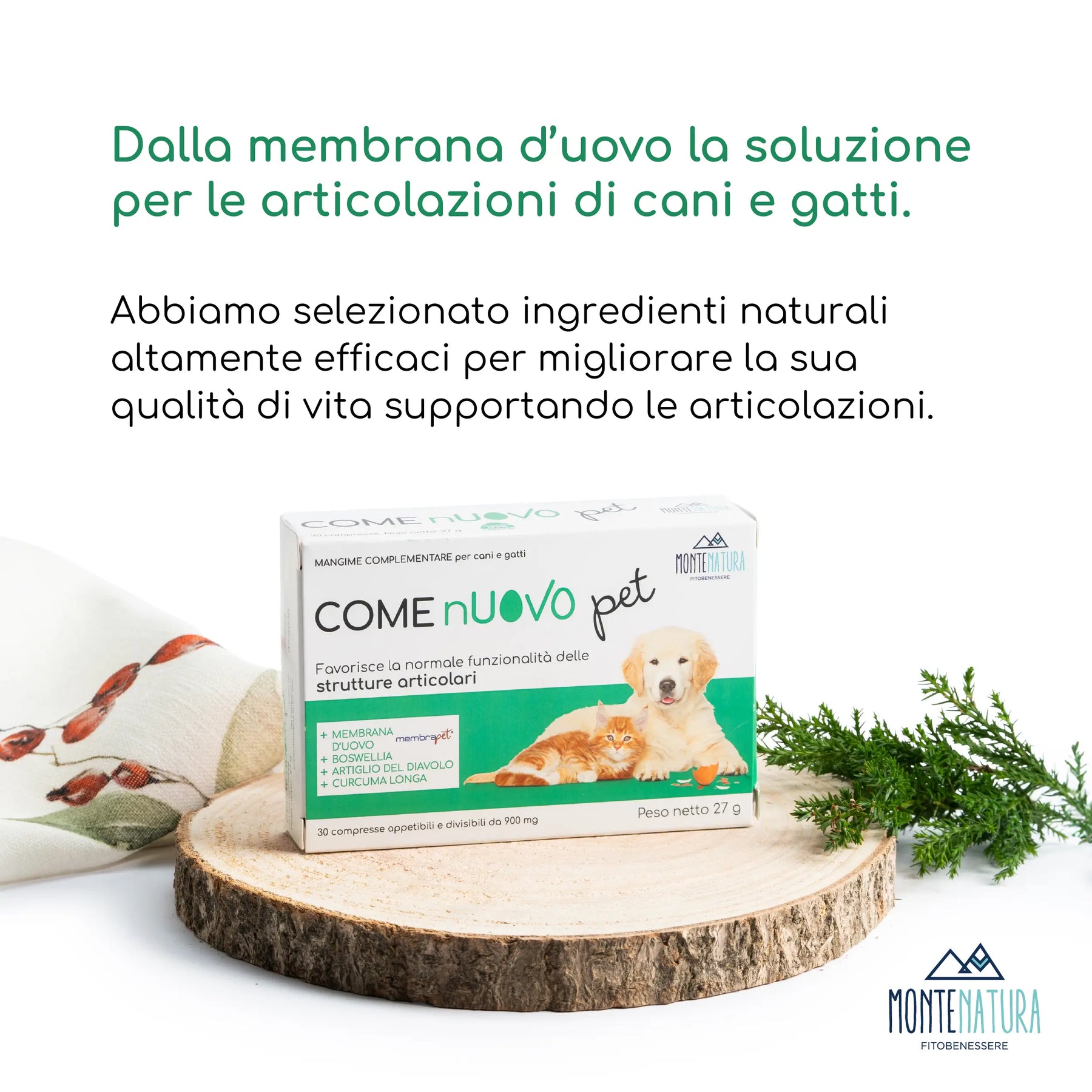 COME nUOVO – Pet è un mangime complementare di moderna concezione che favorisce la fisiologica funzionalità articolare, grazie alla combinazione fra le recenti scoperte scientifiche su Membrapet® in sinergia con le note proprietà antinfiammtorie e analgesiche della Curcuma OxiTurmeric®, dell’Artiglio del diavolo e della Boswellia ad alta titolazione.